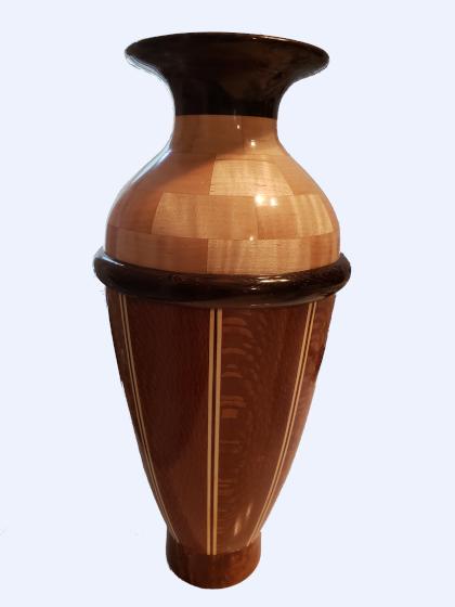 This is a segmented vase I made for my mother's 80th birthday. The vertical staves are made from lacewood with sandwiches of holly and bloodwood for the stripes. The base is amboyna burl and the dark wood on the neck and raised bead is wenge. The dome of the vase is figured maple.